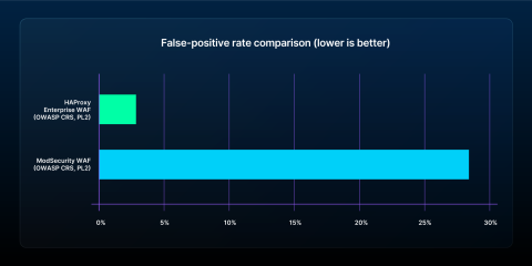 Plus, HAProxy Enterprise WAF generates significantly fewer false positives with OWASP CRS enabled: an impressively low 2.9% false-positive rate at paranoia level 2, greatly outperforming the 28.36% figure for the ModSecurity WAF under identical conditions. This dramatic improvement has been a great relief to teams otherwise saddled with operational overhead and alert fatigue from traditional ModSecurity implementations.