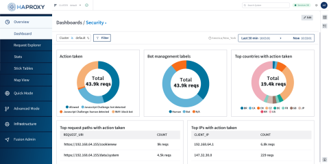 WAF management and observability are streamlined through HAProxy Fusion, the centralized control plane for HAProxy Enterprise. HAProxy Fusion simplifies WAF management across diverse and complex environments, including multi-cluster, multi-cloud, and multi-team deployments. Teams get a unified WAF management interface which lets them upload custom rulesets, set thresholds, add exceptions when needed, and view security responses individually — or globally — across their load balancing clusters.